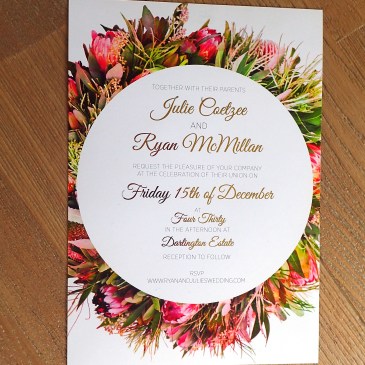 Julie and Ryan’s wedding invite with a digital gold foil finish for the printing.